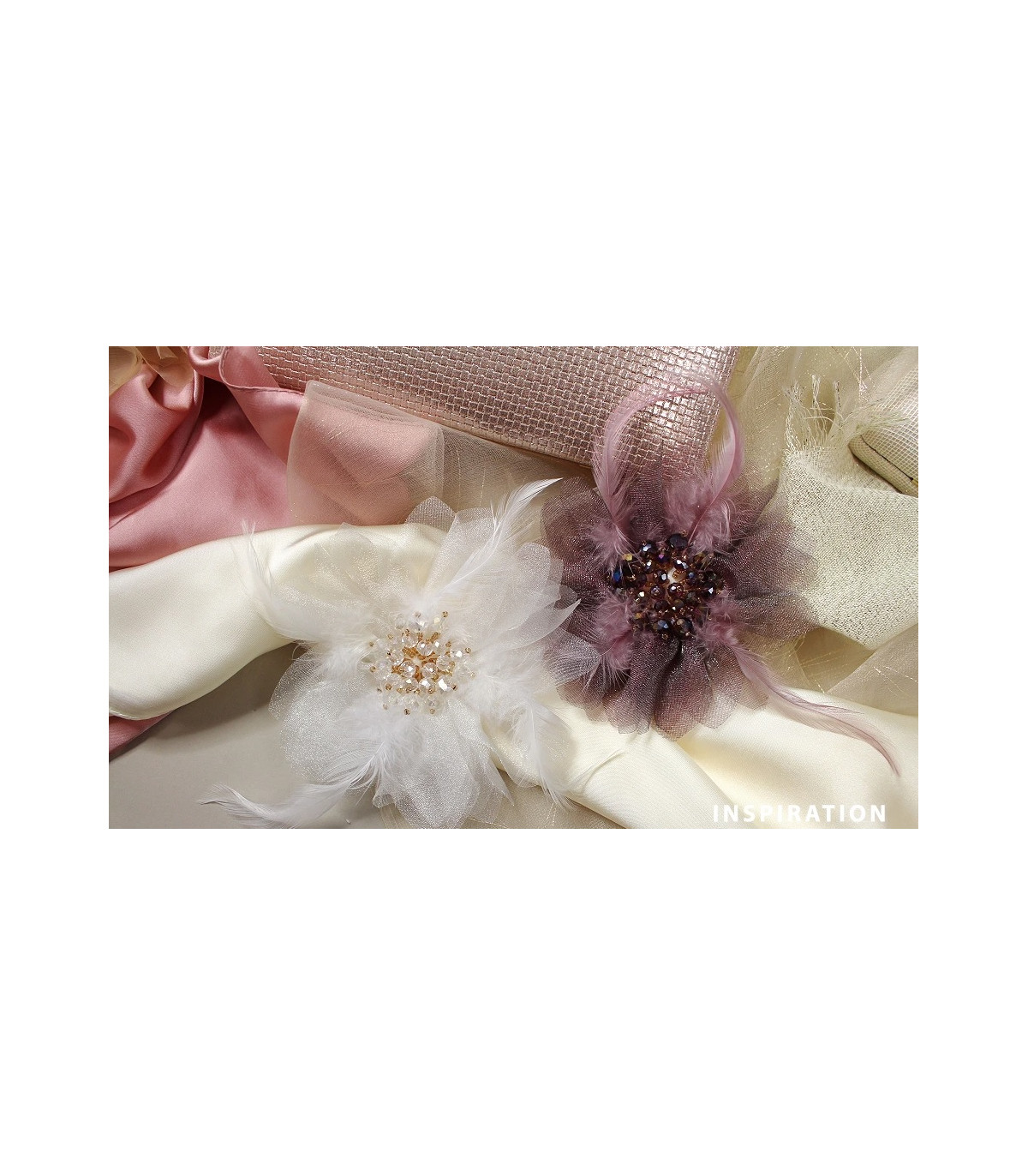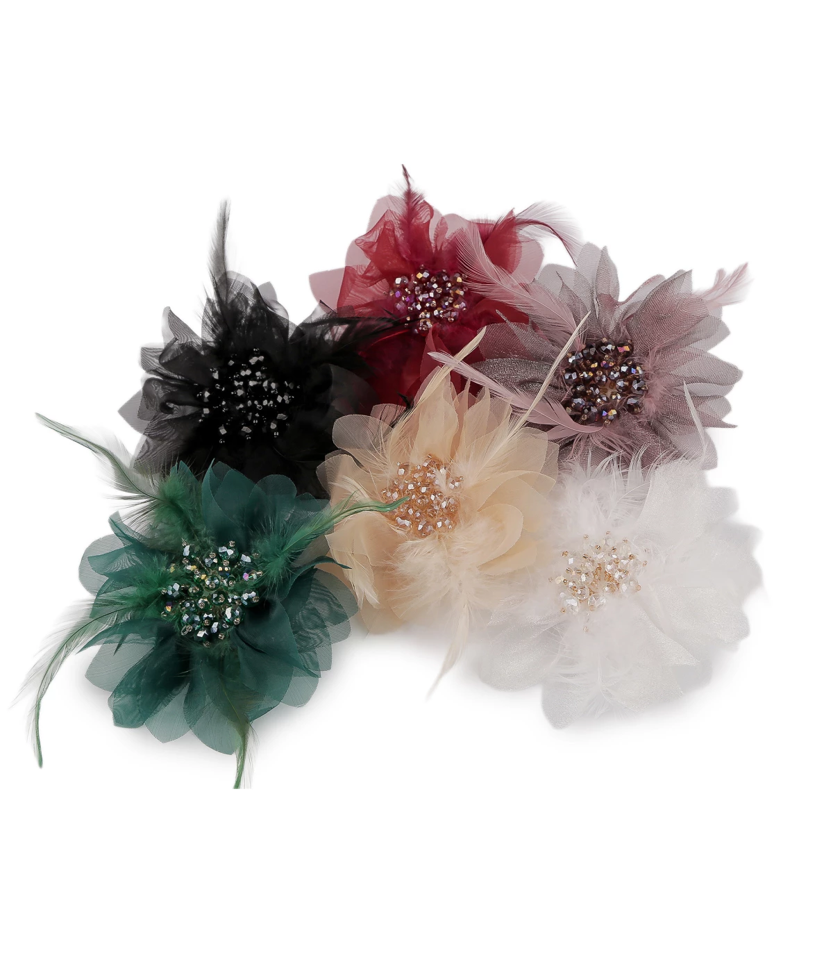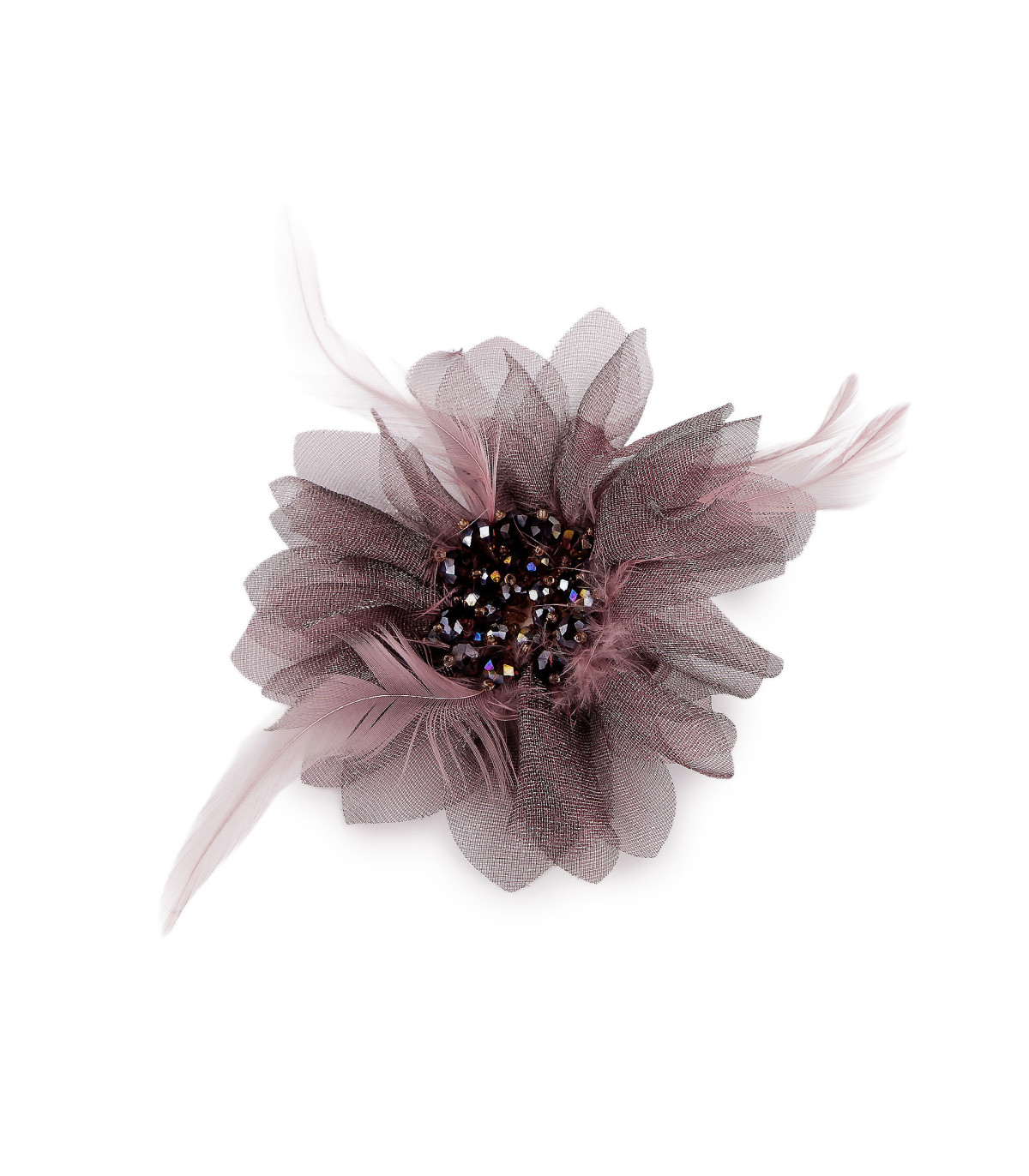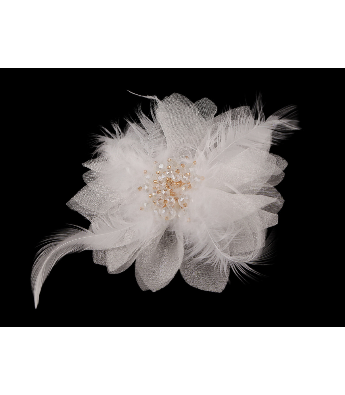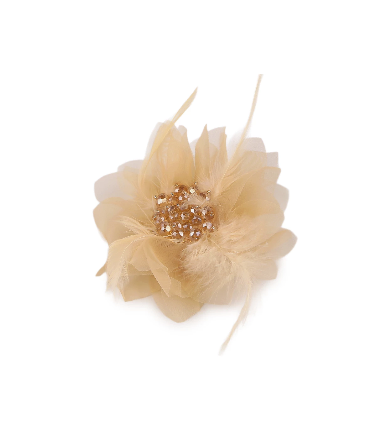 Cette grande broche élégante est confectionnée en mousseline délicate en forme de fleur. Son centre est décoré de plumes et de perles en cristal scintillantes, lui conférant un aspect luxueux.